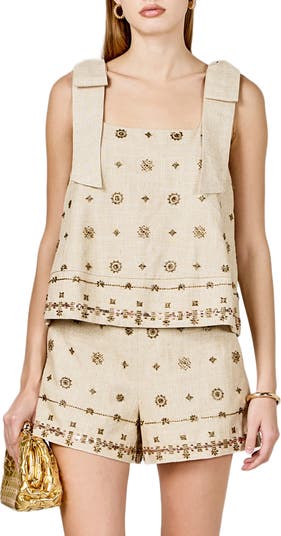 Polished metallic beads create intricate designs on this airy woven top complete with bow-embellished sleeves.