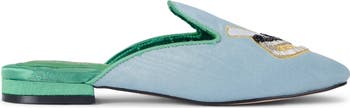 Indulge in the luxuries of life as you lounge in this grosgrain slipper delightfully detailed with caviar and champagne rendered in shimmering beadwork.