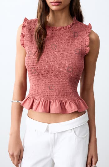 Ruffled trim charmingly frames this smocked tank detailed with beaded designs and an airy cotton fabrication.