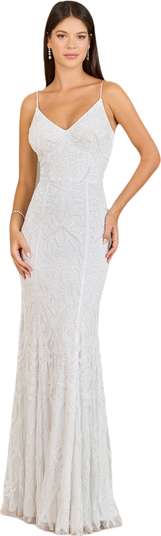 Stunning ivory bridal dress with beads and sequins. It has a v-neckline with spaghetti straps and a fitted bodice to fit your curves