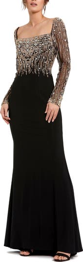 Make an impression in our Beaded Square Neck Long Sleeve Jersey Gown. Featuring intricate beadwork and elegant sleeves, this gown is perfect for formal events.