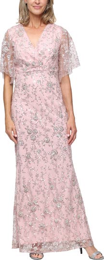 Lustrous sequins and beads create a picturesque floral pattern on an occasion-ready gown framed by a surplice neck and illusion sleeves.