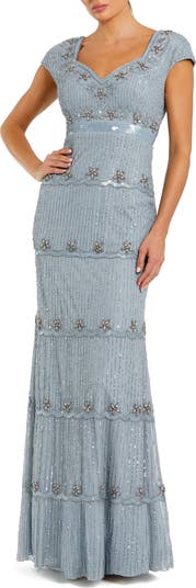 Beaded Sweetheart Neck Sequin Cap Sleeve Gown