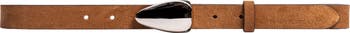 Silver plated bean shaped buckle. Secured on a smooth buffed leather strap.