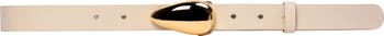 Silver plated bean shaped buckle. Secured on a smooth buffed leather strap.