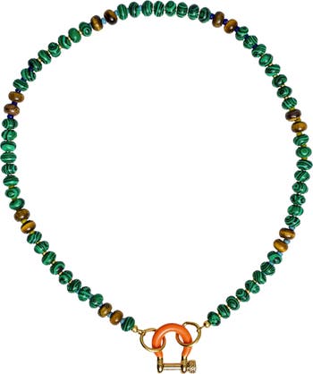 Elevate your style with this stunning 17-inch necklace featuring malachite and tiger eye beads, complemented by 14k gold plated hardware and an enamel carabiner. Perfect for any occasion.