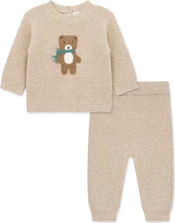 A bouclé bear with a fuzzy scarf makes the perfect snuggly friend in an easy-on sweater that comes with matching knit pants to hug your little one in the comfort of soft cotton. They work great as a set and easily pair with other cozy favorites to bring more warm options when the temperatures fall.