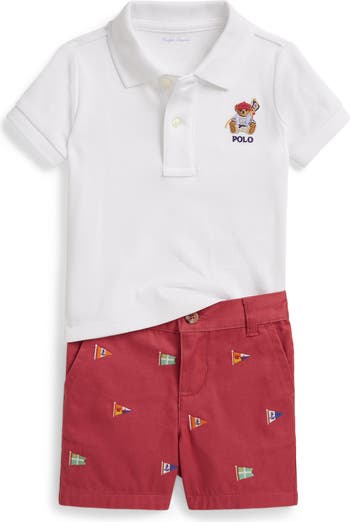The brand's beloved bear mascot and nautical-inspired details bring heritage appeal to a polo and shorts set that has baby sporting a preppy aesthetic.