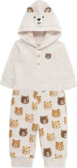 A hooded bodysuit knit with soft waffle stitching has baby feeling ultracozy in this bear-themed set complete with patterned joggers.