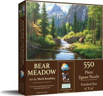 Immerse yourself in the beauty of untouched wilderness with the Bear Meadow 550-piece jigsaw puzzle. As you piece together this enchanting landscape designed by renowned artist Mark Keathley, lose yourself in a peaceful forest scene featuring majestic bears and vibrant flora. Crafted with unmatched quality and craftsmanship by SunsOut, a woman-owned small business in the USA, each piece interlocks seamlessly creating a durable puzzle that stands the test of time. The eco-friendly puzzle is made using soy-based inks and recycled cardboard, creating a premium experience for enthusiasts, all encompassed in a large, full-color display box that highlights the brilliant art, making it an excellent gift. Purchasing a SunsOut puzzle means investing in a worry-free, high-quality product with a guarantee underscoring their commitment to excellent customer service. Each puzzle is a masterpiece featuring fully licensed artwork from top artists, with vibrant colors and intricate details that bring each scene to life. The Bear Meadow puzzle provides the perfect challenge for adults looking to relax or engage in a mentally stimulating activity. It’s a delightful addition to any collection, perfect for nature and animal lovers, or anyone who wishes to travel through art. Celebrate moments of discovery with each piece and derive joy out of the sense of accomplishment once the puzzle is fully assembled and ready to display at a size of 15" x 24".