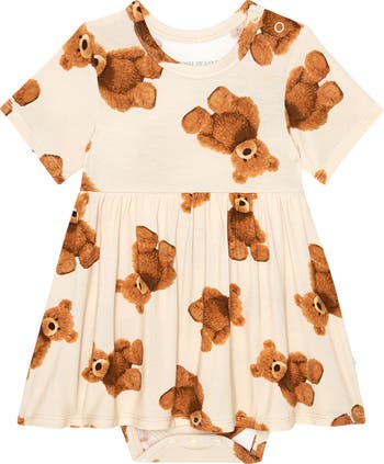 Your little one will look unbearably adorable in this stretch-knit bodysuit showcasing a charming teddy-bear print and flouncy skirt.