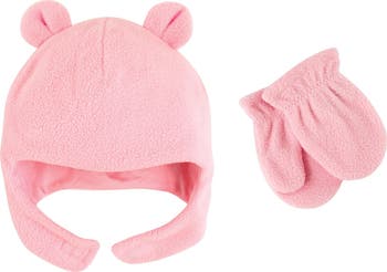 Luvable Friends fleece bear ears hat and mitten set is made of 100% cozy warm polyester fleece and features ear flaps to keep your little one's ears safe and warm on cold winter outings. Combining function with form, these caps feature ears on top to look like teddy bears, brightening up the winter blues of anyone your baby meets. These toasty warm mittens have elastic around the wrist to make sure they stay on and keep your little one's fingers cozy. Machine washable.