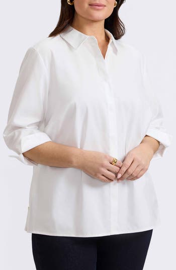 Button accents on the sides and three-quarter sleeves with split cuffs put a fresh update on a classic button-up made from soft, refined cotton twill.