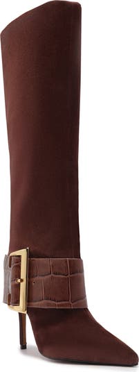 A scene-stealing golden buckle secures the croc-embossed strap of a towering boot framed with a pointy toe and stiletto heel.