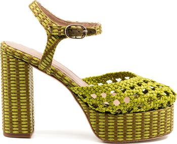 Handmade from woven raffia, this closed-toe platform features a walkable block heel and a buckled ankle strap for secure footing.