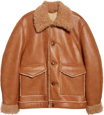This rounded jacket leans into contrast with a satin-sheen faux-leather shell traced in frilly faux-shearling edges that soften each line with cloud-like texture. Curved sleeves exaggerate the volume for a modern cocoon and a deep-pile fleece lining wraps the interior in plush comfort.