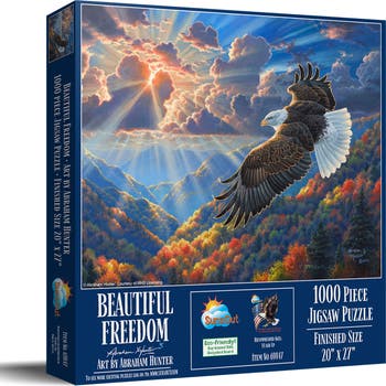Step into the awe-inspiring world of nature with the "Beautiful Freedom - 1000 pc Jigsaw Puzzle" by SunsOut. This breathtaking puzzle, artfully designed by the talented Abraham Hunter, portrays a majestic eagle soaring through a vibrantly colored landscape that personifies freedom. With its high-quality craftsmanship, each piece locks smoothly into place, creating a 20”x 27” tableau that brings nature to life on your tabletop. Pridefully crafted in the USA, SunsOut Puzzles profess high manufacturing standards and offer a worry-free guarantee for any issue with missing or damaged pieces, reflecting their commitment to superior service and excellence. They take an eco-conscious approach to production, using environmentally friendly materials such as soy-based inks and recycled board, creating a guilt-free crafting experience that advocates for environmental preservation. Celebrating creativity, the licensed artwork of artists like Abraham Hunter adorns each large, colorful display box. Whether gifting this keepsake or completing it yourself, this puzzle ensures hours of serene enjoyment and unravels the grandeur of the wilderness within your living space. Experience puzzling in its most divine form with SunsOut's "Beautiful Freedom - 1000 pc Jigsaw Puzzle".