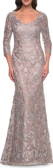 Beautiful lace dress with mermaid style skirt and V neckline. Sheer three quarter sleeve. Back zipper closure.