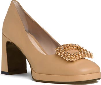 A jewel-encrusted ornament shimmers at the instep of a cushioned leather pump lifted by a subtle platform and block heel for stylish height at your next soirée.
