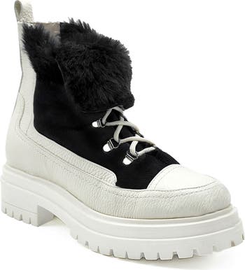 Give your wardrobe a cozy boost with this lugged platform boot fashioned from soft suede and leather panels warmed by a fluffy shearling lining.
