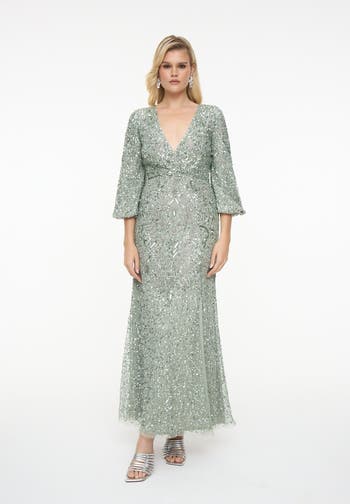 Turn every head in the room with our Sage Green Sequin Embellished Evening Gown, a breathtaking blend of sophistication and glamour. This exquisite floor-length gown is adorned with intricate sequin detailing that shimmers beautifully with every step, making it the perfect choice for galas, receptions, or red-carpet moments. The gown features a deep V-neckline that adds a touch of allure, while the three-quarter sleeves provide elegant coverage. Designed with a figure-flattering silhouette, it gently hugs the waist before cascading into a graceful A-line hem. The soft sage green hue complements all skin tones, creating a timelessly elegant look that’s both modern and refined. Crafted from premium quality fabric with a smooth inner lining, this gown ensures comfort without compromising on style.