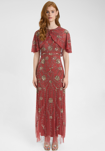 Radiate timeless grace in this exquisite wine-red embellished gown, designed with intricate floral embroidery and shimmering bead work throughout. The dress features a round neckline paired with elegant cape-style short sleeves that drape effortlessly, adding a touch of vintage sophistication. The fitted waistline flows into a floor-length skirt, enhancing the silhouette while maintaining a refined charm. Perfect for evening galas, weddings, or formal celebrations, this gown blends comfort with couture-inspired detailing, making it a true wardrobe statement.
