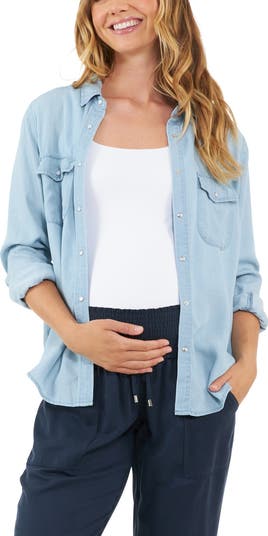 Our Bec Chambray Shirt has the look of a classic denim shirt but with the soft feel of tencel. This shirt is so versatile, you'll be wearing on repeat through pregnancy and beyond! Featuring front patch pockets and a nursing-friendly button through design. The relaxed fit and classic silhouette looks great styled with jeans, legging or over dresses.
