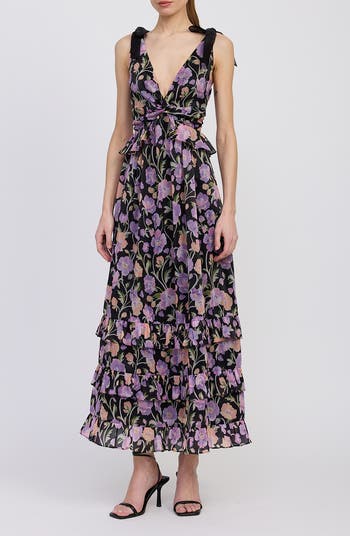 Bring the garden to the party in a flowery dress hung from tied straps and finished in rows of ruffles.