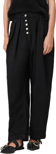 Stay on trend with these denim trousers cut in a loose and slouchy fit with a pleated high waist that releases into the modern barrel-leg silhouette. Organic-shaped gilded buttons front the look for a chic finishing touch.