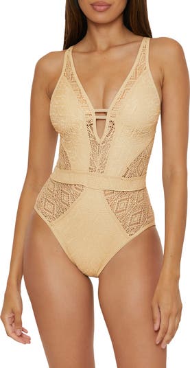 Stretch-hinted shimmering mesh—left peekaboo sheer in just the right places—creates an hourglass shape on this plunge-neck swimsuit.