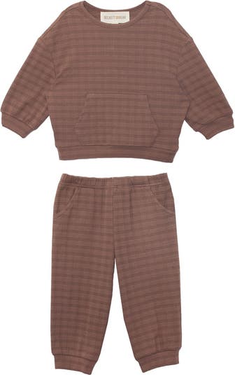 The Theo two-piece toddler set features a cozy brown checkered long-sleeve top and matching pants. The crewneck top includes a kangaroo pocket and ribbed cuffs, while the pants have an elastic waistband and side pockets for easy wear. Ideal for all-day play or lounging; machine wash cold, line dry, do not bleach.