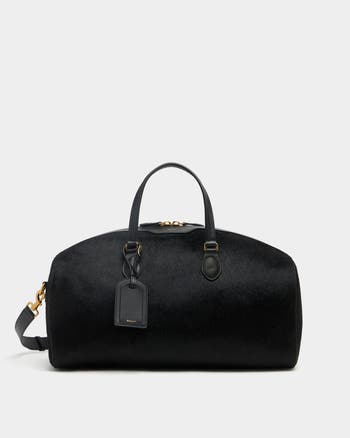 This Beckett duffle bag reimagines a classic structure with the luxurious texture of black pony hair. Trimmed in tonal leather, a Bally Crest sits between the two top handles. The Ribbon strap can be adjusted for a choice between shoulder or crossbody carry, revealing the practical design of this ample bag.