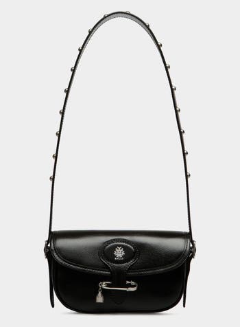 This Beckett minibag in black craquelure leather is embellished by a Belle safety pin and a Bally Crest on the front flap. Two interchangeable straps, one short and one longer, offer shoulder or crossbody portability.