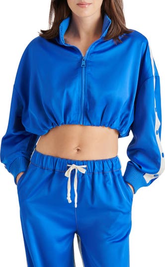 Bring an undeniably sporty element to your street style with this cropped satin jacket complete with contrasting stripes down the sleeves.