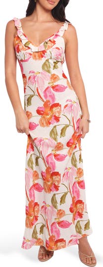 Ruffle trim highlights the V-neck of this airy woven dress in a painterly floral print.