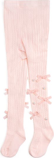 - Soft pink tights with soft pink velvet bows and pearl accents.