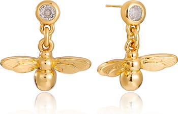 Cubic zirconia bezels highlight the organic sweetness of these honey bee drop earrings plated in warm 18-karat gold.