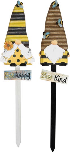 Add a whimsical touch to your garden with this set of yard signs. These charming wood gnome signs feature bee designs that add a pop of color to your outdoor space. Crafted with metal stakes, these sturdy gnomes are ready to grace your yard with their enchanting presence, creating a buzz of excitement among your garden blooms. Product Features: Decorative bee yard stakes Gnomes with a bees design Signs reads "Bee Kind" and "Bee Happy" For outdoor use only Dimensions: Black stake: 24"H x 4.75"W x .75"D White stake: 23"H x 5.25"W x .75"D Material(s): wood/metal
