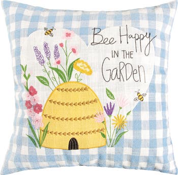 Bring a cheerful, garden-inspired accent to your home with the Bee Happy in the Garden Embroidered Cotton Blend Pillow, an 18-by-18-inch square accent piece designed for spring and summer living. The blue and white gingham check ground immediately sets a casual, cottage-friendly tone, while the heart-shaped white appliqué panel at the center draws the eye with its embroidered garden scene. The scene features a golden beehive with detailed stitch work, a surrounding arrangement of colorful wildflowers in lavender, pink, yellow, and purple, and two small bees in flight. The sentiment Bee Happy in the Garden is worked into the panel in a charming mix of print and script lettering that adds a warm, hand-lettered feel. Crafted from a cotton blend, this pillow delivers a soft, comfortable surface suited for everyday accent use on sofas, armchairs, and beds. The blue gingham and botanical details suit spring, summer, and garden-themed interiors, and this pillow makes a thoughtful and memorable gift for anyone who loves whimsical, nature-inspired home accents.