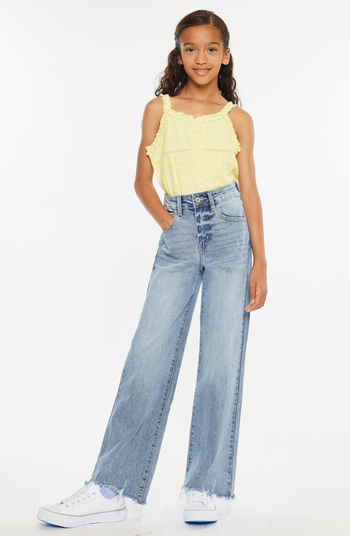 Our Aster Mid Rise Flare Kid Jeans are a classic wide leg Jean is meant for all day comfort. Comes in a light wash with light whiskering and a hem detail. Features a 5 pocket style, single front button closure, and zip fly.