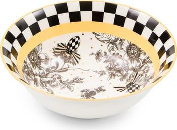 Serve up your favorite dishes in this ceramic bowl decorated with a charming bee motif highlighted by a yellow band and black and white checks.