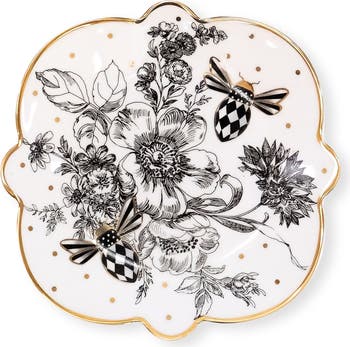 Serve your freshly baked bread on this porcelain serving platter trimmed with a golden rim and decorated with a charming bee motif highlighted by a yellow band and black and white checks.