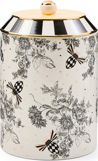 Keep countertops tidy with this gorgeous ceramic canister sealed off with a matching gilded lid and painted in a gorgeous toile print.