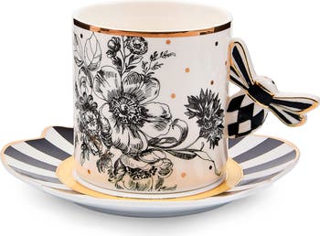 A bee-autiful black-and-white toile pattern details a porcelain mug designed with a bee-shaped handle and coordinating striped saucer. The gilt-edged pieces will add a dose of whimsical charm and personality to your table.