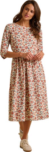 Our Beech Dress is your go-to floral midi dress with pockets. Featuring an autumnal palette, wide neckline, ¾ notch sleeves, hidden side zip and waist tie. Style with classic casual white trainers or elevate with a jacket and chelsea boots.