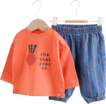 Punny graphics stamp a stretchy cotton T-shirt that coordinates perfectly with striped cotton pants in this set that will keep baby comfy throughout playtime and beyond.