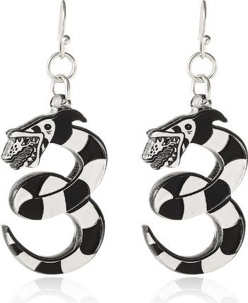 Channel bold, spooky-chic vibes with these Beetlejuice-inspired snake earrings. Designed with iconic black and white stripes and a fierce snake motif, these drop earrings bring a playful yet edgy twist to your jewelry collection. Perfect for Halloween or anytime you want to make a statement.