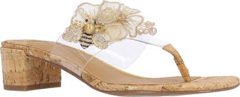 Dimensional bee and flower embellishments add a touch of contemporary whimsy to a block-heel sandal grounded by comfortable memory foam cushioning.