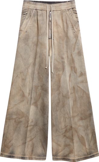 These mottled denim pants are cut with a wide leg and low crotch and constructed with a relaxed elasticized drawstring waist. Crafted from medium-weight black Japanese denim, the pants are treated with a three-step stonewash, mineral dye and spray process to achieve the dust-wash look.