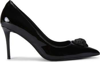A jewel-encrusted eagle head adds signature allure to a pointy-toe court pump featured in glossy leather and lofted by a soaring stiletto heel.